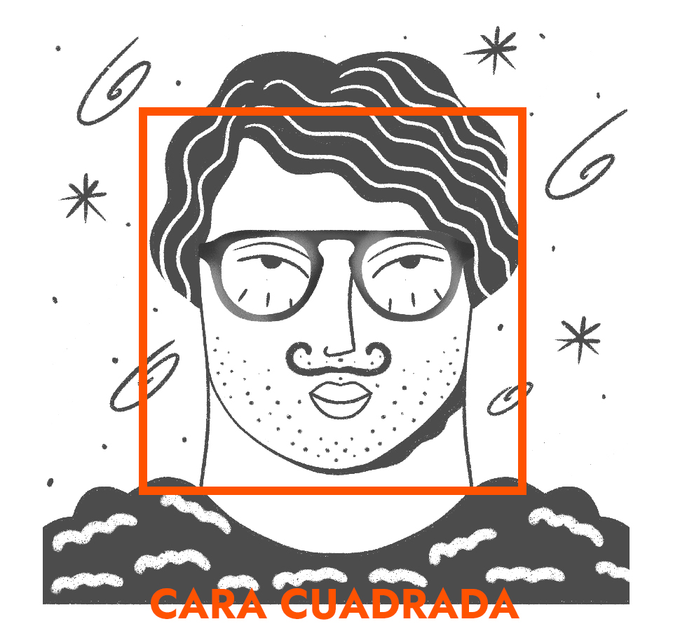 Este rostro de forma cuadrada tiene la frente, la mandíbula y los pómulos de igual anchura. Sus rasgos son fuertes y angulosos. Elija gafas redondas u ovaladas para suavizar sus rasgos. Los modelos con forma de piloto, como las K34, suavizarán los pómulos. Las monturas finas y más anchas que sus pómulos le sentarán de maravilla.